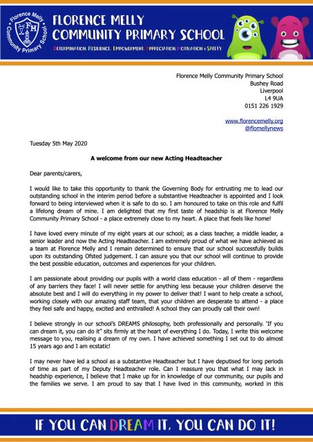 A Welcome Letter to Parents from our (not so new) Acting Headteacher