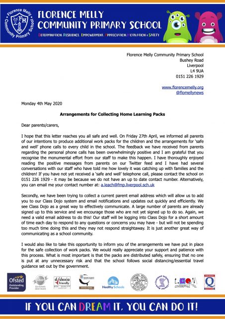 Please find attached the arrangements we have put in place for the safe collection of work packs. We would really appreciate your support and patience with this process. What is most important is that the packs are distributed safely, ensuring that no one is put at any unnecessary risk and that the school follows social distancing/essential travel guidance set out by the government. Thank you, take care and stay safe!