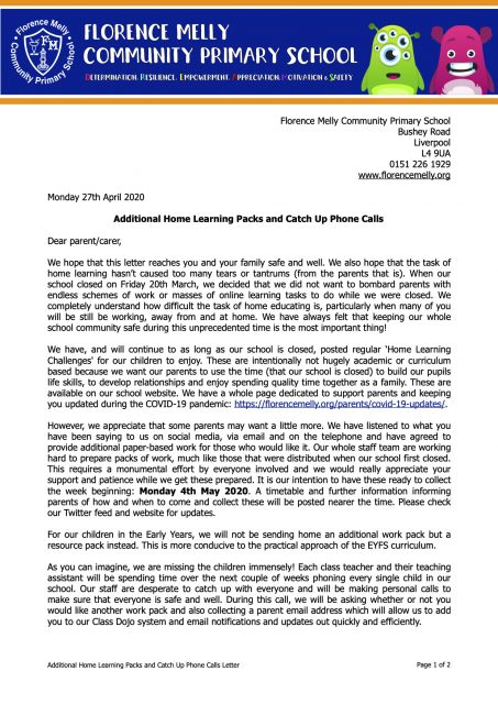 Good afternoon all. We hope that this reaches you safe and well. On Friday we informed parents via Twitter that we would release more information today about our plans to distribute additional work packs and call our pupils. Please find below a letter from the SLT clarifying these arrangements. We hope that this helps! Thank you for your support and patience! Take Care – The Senior Leadership Team.