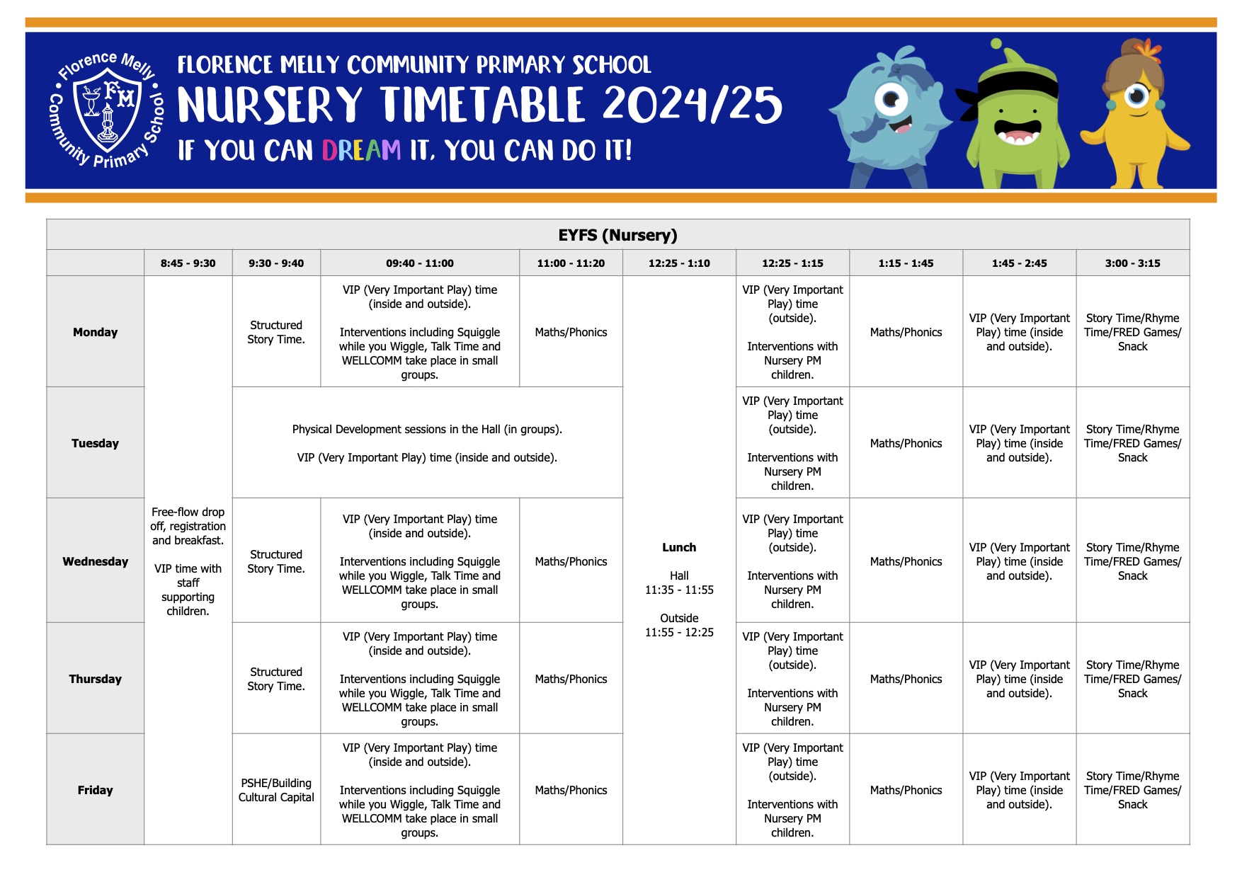 Please click on the images below to access the Nursery timetable for this term. This is printable and would look perfect on your fridge!