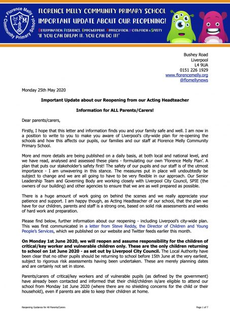 Please see the important update, from our Acting Headteacher, about our reopening. This information is for ALL parents and illustrates Liverpool’s city-wide plan for re-opening the schools and how this affects our pupils, our families and our staff at Florence Melly Community Primary School. Take care and stay safe!