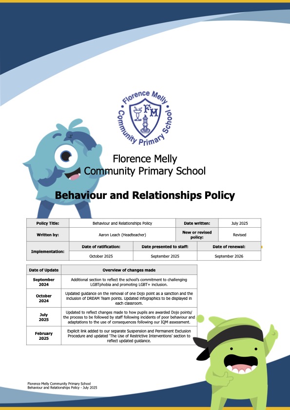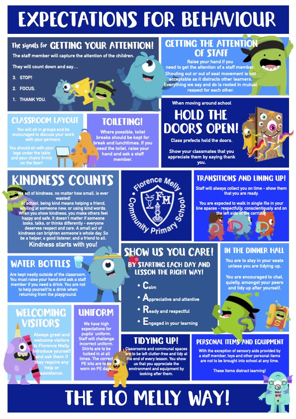 At Florence Melly Community Primary School, we are committed to creating a safe, inclusive and supportive environment where all children can learn and thrive. Positive behaviour is promoted through clear expectations, strong relationships and early support.