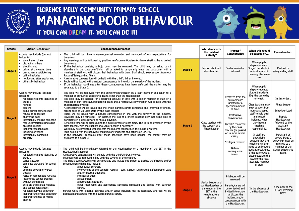At Florence Melly we believe that children have a right to learn, free from disruption and interruption from others. Our children have a responsibility to behave well in class and be good citizens. For behaviour to be managed effectively it is really important for teachers and parents to work together. Please find below guidance and the procedures we use to manage incidents of poor behaviour.