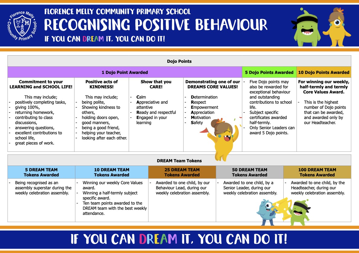 We currently use the Class Dojo platform to encourage and reward positive behaviour in school. Children can earn Dojo points by demonstrating positive behaviour such as helping others, working hard, being kind to others and making good progress during lessons. Details of how Dojo points can be earned can be found below.