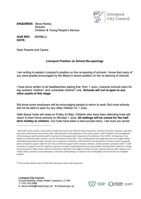 Letter from the Director of Children and Young People’s Services – Liverpool’s City Wide Position on Schools Reopening!
