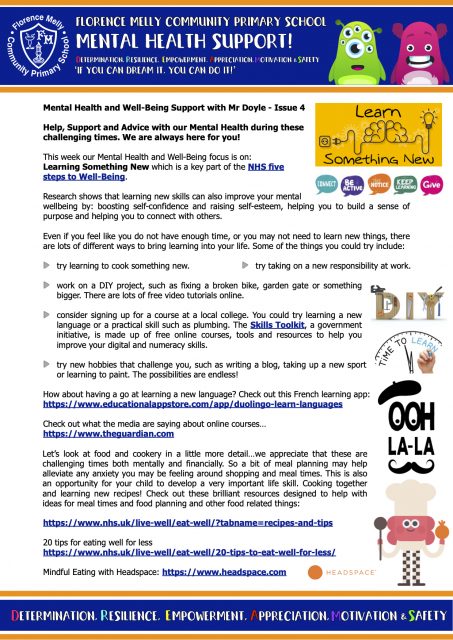 Please find below a copy of this week’s Mental Health and Well Being Resource from Mr Doyle. This week the focus is on Learning Something New, paying particular attention to food and cookery! Check out some of the fabulous resources deigned to help support your mental health and well-being during the COVID-19 pandemic. Enjoy…