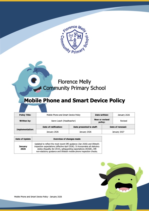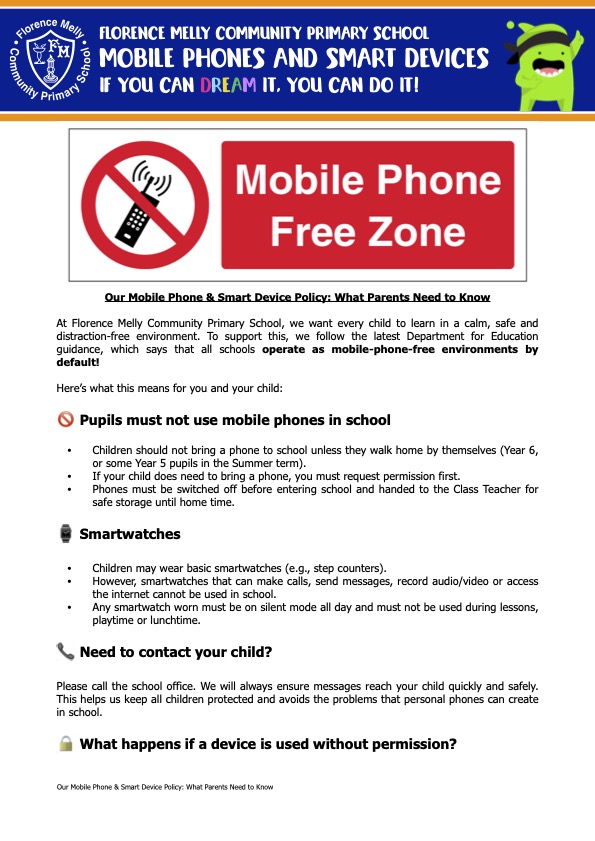Florence Melly Community Primary School is committed to providing a calm, safe and supportive learning environment free from unnecessary distractions. Mobile phones and smart devices can disrupt learning, present safeguarding risks, contribute to online harms, and affect pupil wellbeing. The Department for Education (DfE) strongly recommends that all schools operate as mobile‑phone‑free environments by default, unless there is an agreed exception. This policy also reflects Ofsted’s updated inspection framework, which requires inspectors to check whether school mobile phone policies are understood, consistently applied and effective in supporting positive behaviour, attendance and wellbeing.