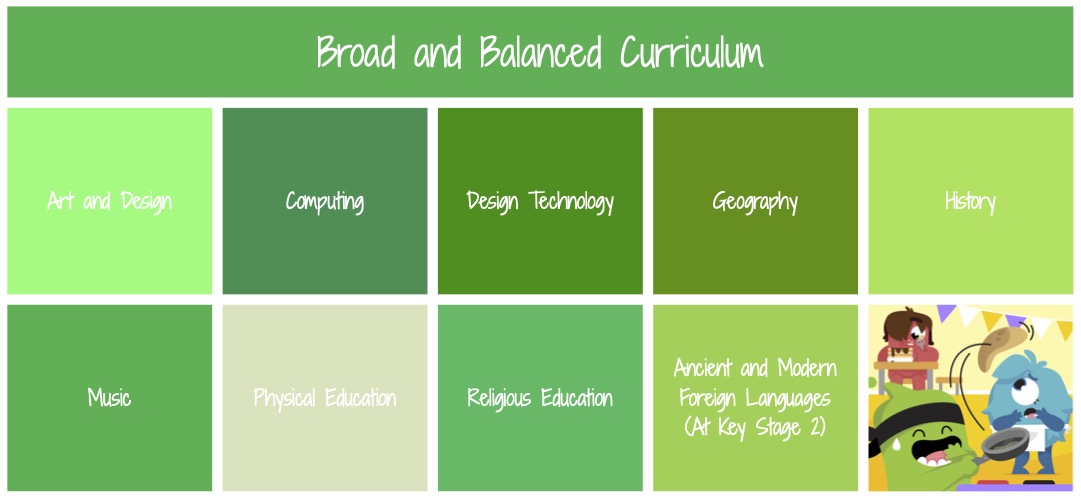 • Our Broad and Balanced Curriculum offer explores: the wider foundation subjects including History, Geography, Art and Design, Design Technology, Physical Education, Music, Modern Foreign Languages (Spanish), Computing and Religious Education.