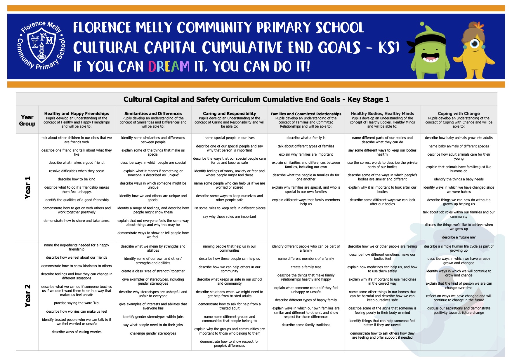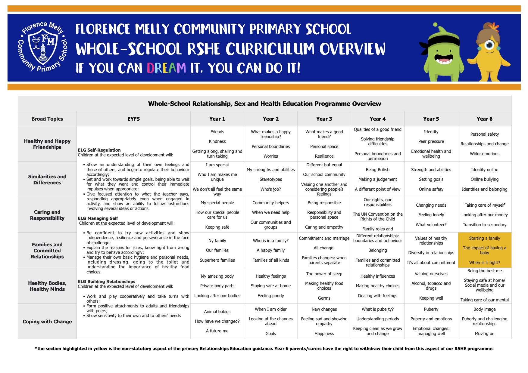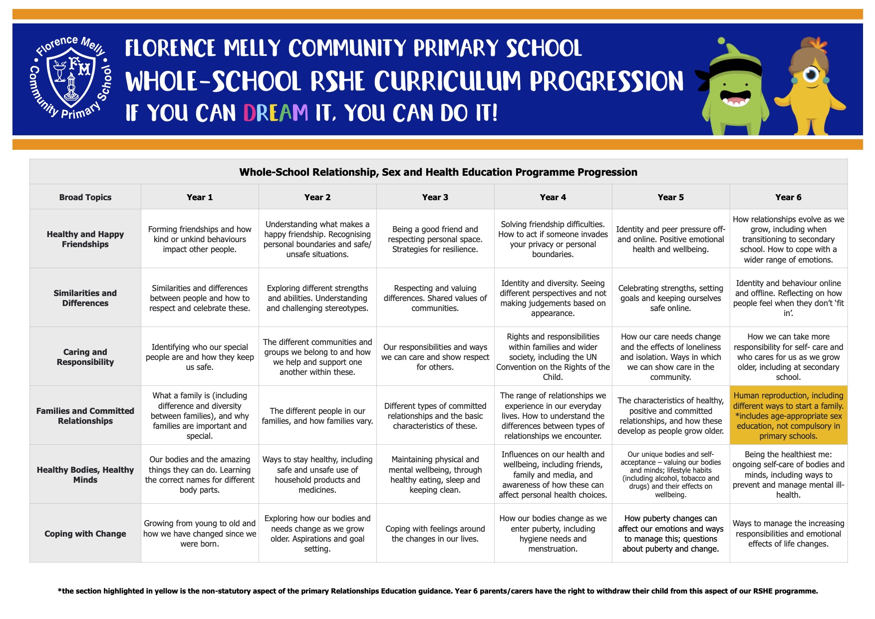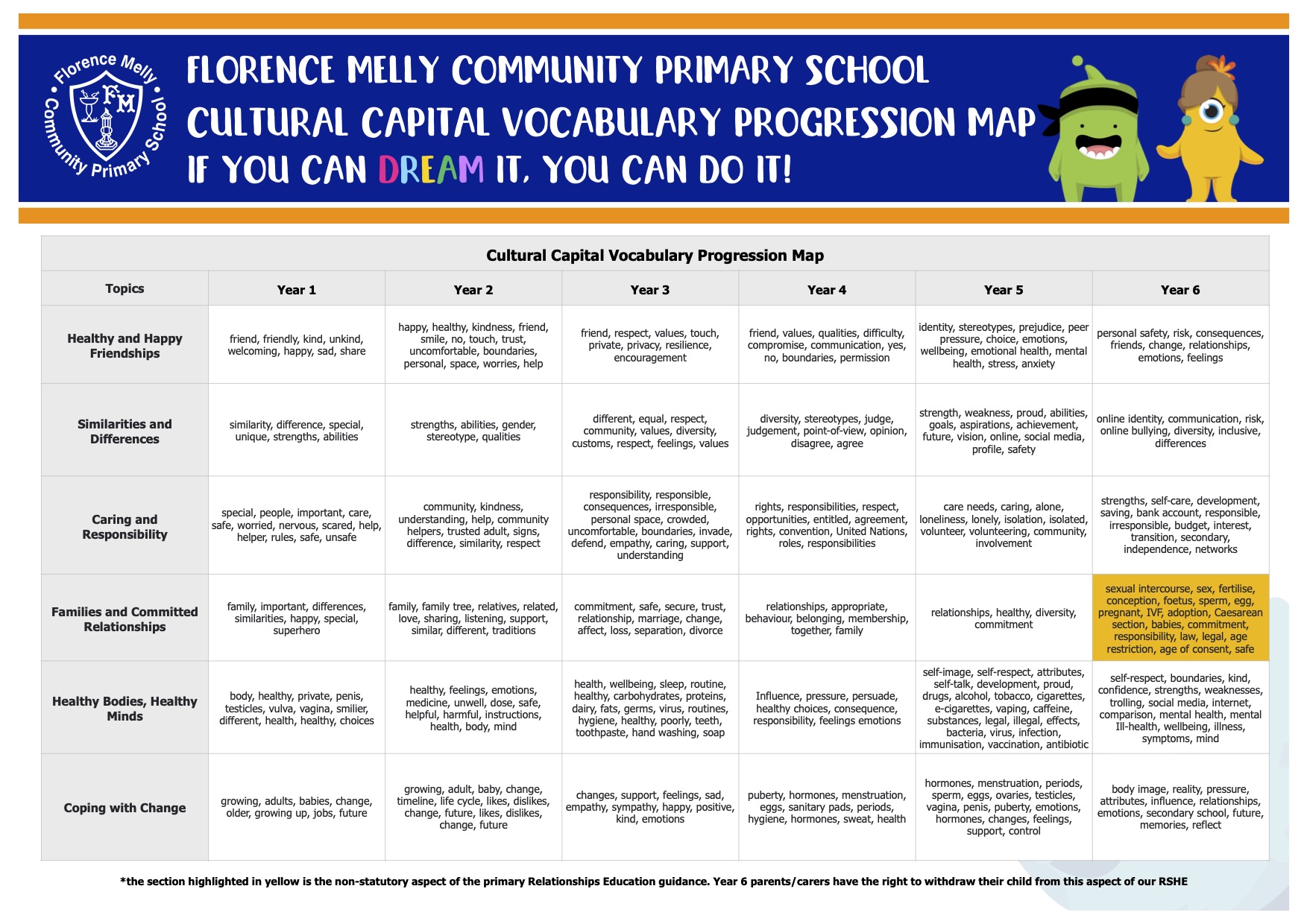 At Florence Melly Community Primary School, we welcome and embrace this legislation, as we always place a high priority on delivering these essential messages through our vibrant ‘Cultural Capital and Safety’ Curriculum. The inclusion of Relationships, Sex and Health Education represents a huge opportunity to help our children and young people develop. The knowledge and attributes gained by exploring the key themes and topics will help to keep them safe and support their own, and others’, health and wellbeing and help our pupils to become successful and happy adults who make a meaningful contribution to society.
