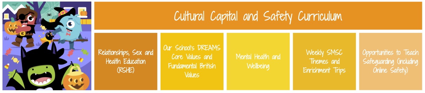 - Our Cultural Capital and Safety Curriculum offer draws together: PSHE, Relationship and Sex Education (RSHE), our Core and British Values, Mental Heath and Wellbeing, SMSC and safeguarding (including online safety). As part of our Cultural Capital curriculum we embed key health, wellbeing and safety messages so that our children are provided with the knowledge and skills to be physically and mentally healthy and safe in school and beyond the classroom. We promote key safety messages including: how to stay safe online, an awareness of child on child abuse and how to recognise the signs of positive and poor mental health.