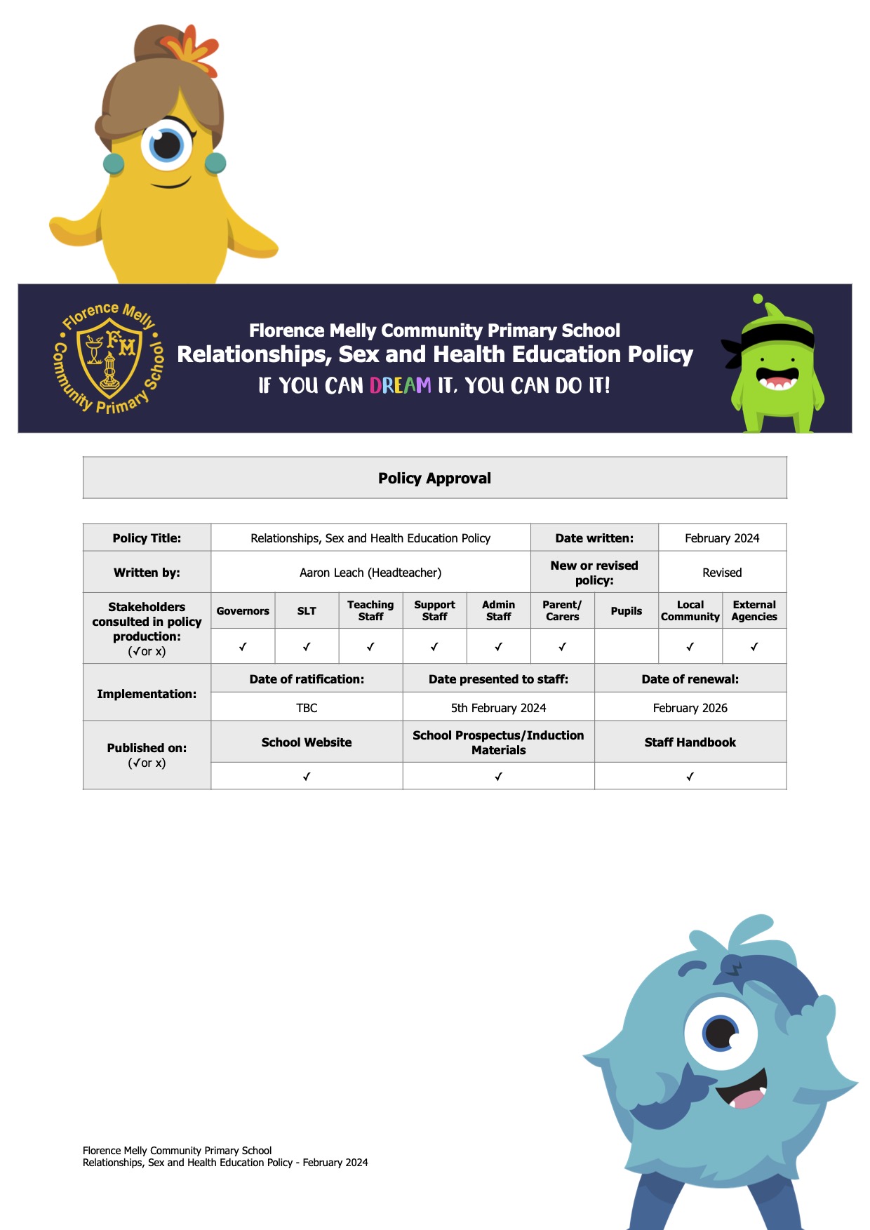Our policy has been written in accordance with the statutory guidance document: Relationships Education, Relationships and Sex Education (RSE) and Health Education (DfE, 2021).