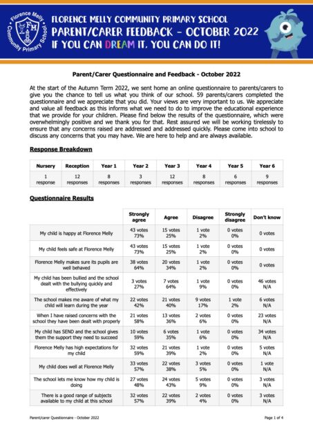 Parent/Carer Questionnaire and Feedback – October 2022