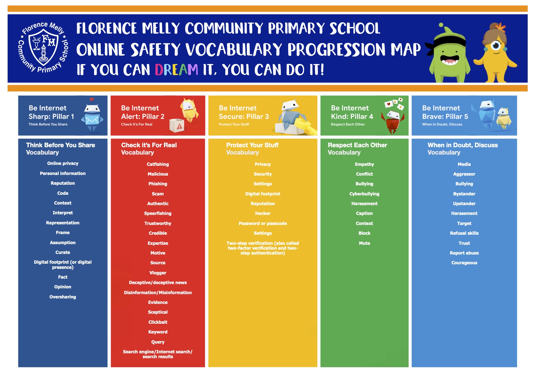 Please find below a copy of our Online Safety Vocabulary Progression document. This sets out the Tier 3 vocabulary that our pupils are taught during their online safety lessons.