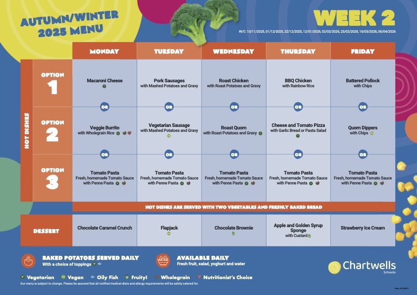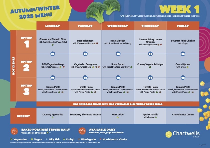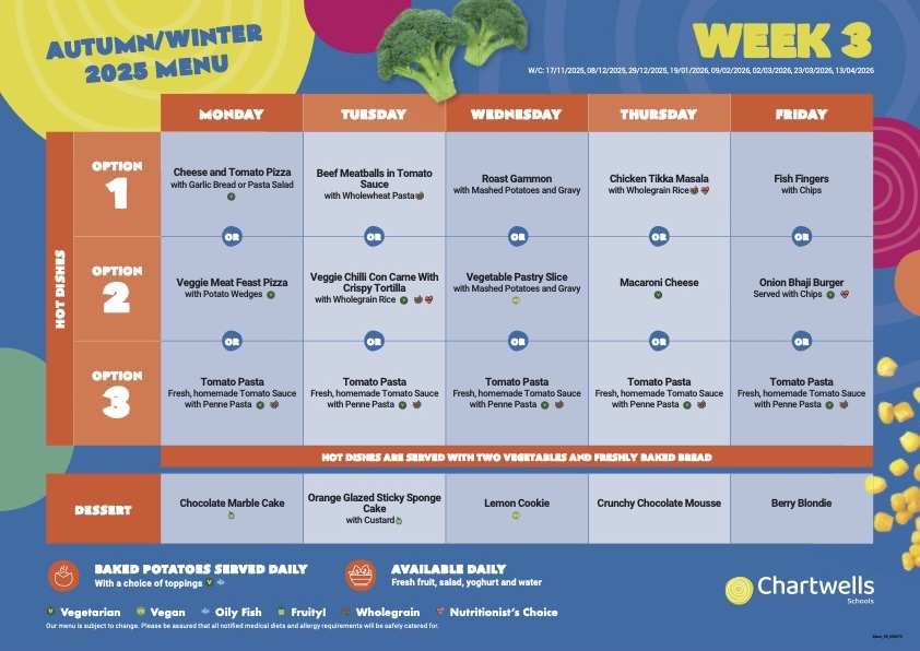 The hot-dinner offer from Chartwells changes regularly and runs on a three-week cycle. For this term’s menu, please click the link below:
