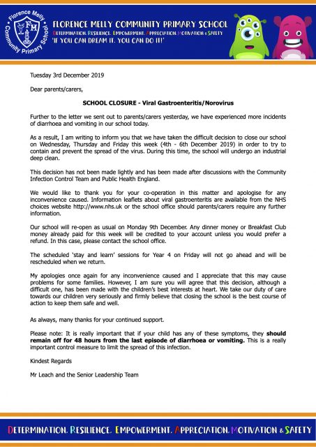 Further to the letter we sent out yesterday, we have experienced more incidents of diarrhoea and vomiting in our school today. As a result, I am writing to inform you that we have taken the difficult decision to close our school. The school will be closed on Wednesday, Thursday and Friday this week (4th – 6th December 2019) in order to try to contain and prevent the spread of the virus. During this time, the school will undergo an industrial deep clean. The following letter will be sent home with your child at the end of the school day. We apologise for any inconvenience caused. I am sure you will agree that this decision, although a difficult one, has been made with the children’s best interests at heart. We take our duty of care towards our children seriously and believe that closing the school is the best course of action to keep them safe and well.