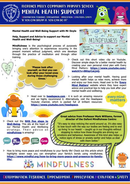Check out this week’s Mental Health and Well-Being resource from Mr Doyle. It is packed full of amazing hints and tips to help support you and your family during these difficult times. This edition focusses on ‘mindfulness’. Why don’t you take five, have a read and take the time to improve your mental health and well-being!