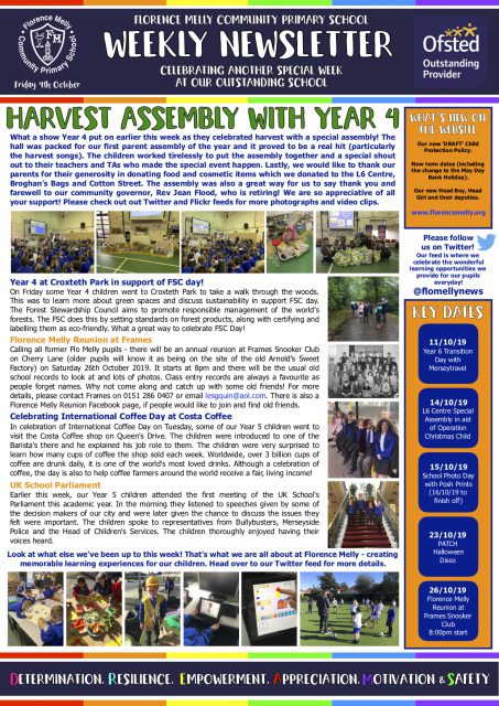 Check out this week’s newsletter – which is packed full of the memorable experiences we provided for our pupils this week! A special shout out to Miss Batt, Mrs Matthews, Mrs Woodhouse, Mrs Sainsbury, Miss Conlon and the Year 4 children for putting on a spectacular harvest assembly – which has taken the headline news space for this week! It really was a special week at Florence Melly Community Primary School.