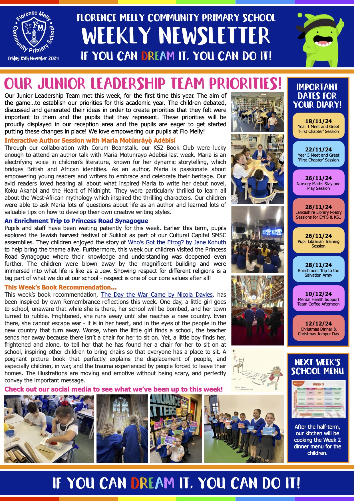 Our latest newsletter can be accessed by clicking the following link: Newsletter 15/11/24. Have a wonderful weekend all. See you bright and early on Monday morning.