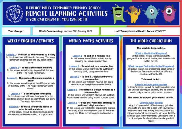 Here is the latest Year 1 Remote Learning Template (as a result of the outbreak in Year 1)…